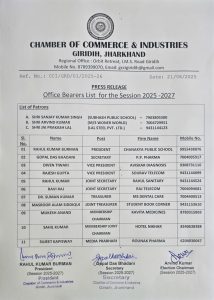 चैंबर ऑफ कॉमर्स एंड इंडस्ट्रीज गिरिडीह शाखा का ग्यारह सदस्यीय कमेटी का गठन किया गया। इस कमेटी में तीन सदस्यों को संरक्षक भी बनाया गया है। गौरतलब है कि हाल ही में सीसीआई का चुनाव संपन्न हुआ था जिसमें राहुल वर्मन अध्यक्ष व गोपाल दास भदानी सचिव निर्वाचित हुए थे। आज इन पदाधिकारियों ने सत्र 2025-27 के लिए नए कमेटी का गठन किया है। इस कमेटी में संजय सिंह, अरविंद कुमार व जयप्रकाश लाल को संरक्षक मनोनीत किया गया। इसके अलावे दिवेन तिवारी व राजेश गुप्ता को उपाध्यक्ष, राहुल कुमार व रवि राज को संयुक्त सचिव, डॉ सुमन कुमार को कोषाध्यक्ष मनोनीत किया गया, जबकि मशरुर आलम सिदिक़्क़ी को सह कोषाध्यक्ष, मुकेश आनंद को मेम्बरशिप चेयरमेन, साहिल कुमार को संयुक्त मेम्बरशिप चेयरमेन व सुजीत कपिसवे को मीडिया प्रभारी का दायित्व सौंपा गया।